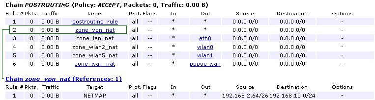 Once again we want to integrate the required rules nicely into the OpenWrt firewall concept. Let us start with the destination translation in the prerouitng chain. We want to translate the target IP of packets that come out of the tunnel into the matching ones of our internal subnet. OpenWrt automatically creates two chains for the VPN zone: zone_vpn_prerouting and prerouting_vpn. They are already linked correctly but have to be populated correctly. Just a source/destination address match paired with a NETMAP translation will do what is required. Have a look at the picture.
