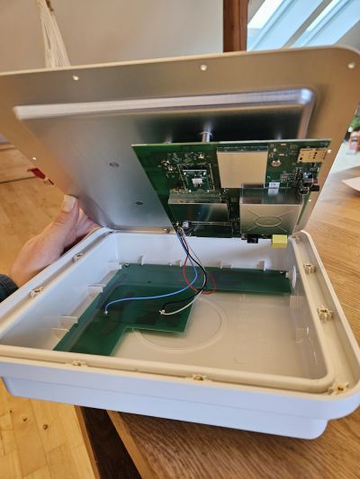 Remove the SIM/button/LED cover and 12 screws holding the back plate and antenna cover together. Be careful with the cables.