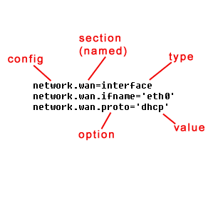 touch /etc/config/example uci set example.this_name=blah uci set example.this_name.xxx=yyy uci set example.other_name=blah uci set example.other_name.yyy=zzz uci commit example